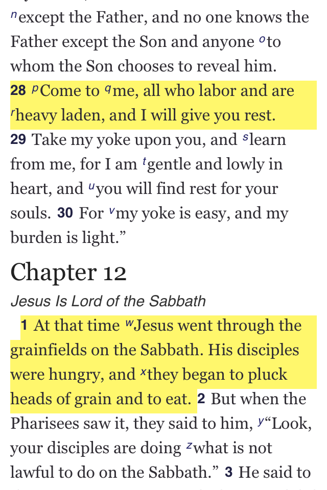 Jesus had just declared himself as the chosen one, the answer they were waiting for, and then called on God to spiritually open their eyes and to give them rest in Jesus, to lay their burdens down on him. It was at that time that Jesus, always on mission, went through the grain fields to pick up food…on the Sabbath day.